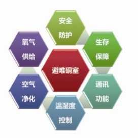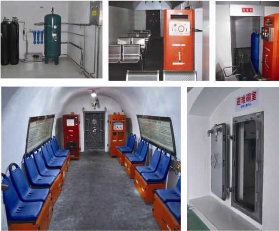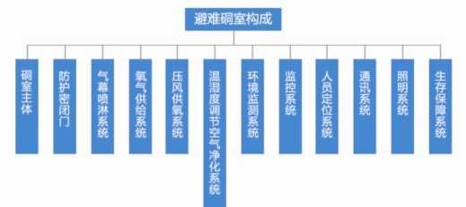 避難硐室設(shè)置在式煤礦井下適當(dāng)位置,配備有維持人員生存所需的相關(guān)設(shè)備設(shè)施和食物、水等,為保證煤礦災(zāi)害發(fā)生時(shí),給無法撤離災(zāi)區(qū)的遇險(xiǎn)人員提供生命保障的空間。避難硐室與礦井安全監(jiān)測(cè)監(jiān)控、人員定位、壓風(fēng)自救、供水施救、通信聯(lián)絡(luò)等系統(tǒng)相連,形成井下整體性的安全避難系統(tǒng),主要由防爆密閉系統(tǒng)、氧氣供給系統(tǒng)、通訊及人員定位系統(tǒng)、監(jiān)測(cè)監(jiān)控系統(tǒng)、環(huán)境控制系統(tǒng)、照明系統(tǒng)、生存保障系統(tǒng)組成。
