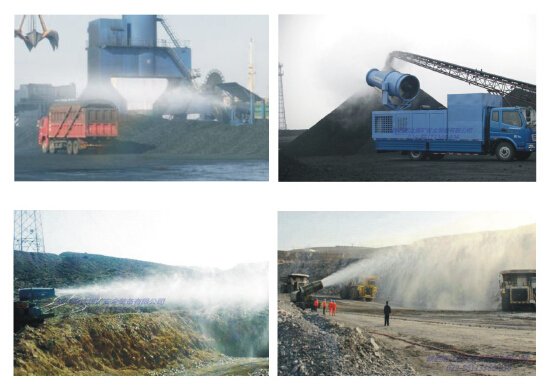風(fēng)送式遠(yuǎn)程地面噴霧降塵系統(tǒng)利用高峰壓,大流量專用軸流風(fēng)機(jī)驅(qū)動,通過導(dǎo)流風(fēng)筒,形成高速氣流,撞擊破碎安裝在風(fēng)筒出口的噴嘴,形成霧化粒度高(100um)射程遠(yuǎn)(100米),指向性強(qiáng)的霧流。